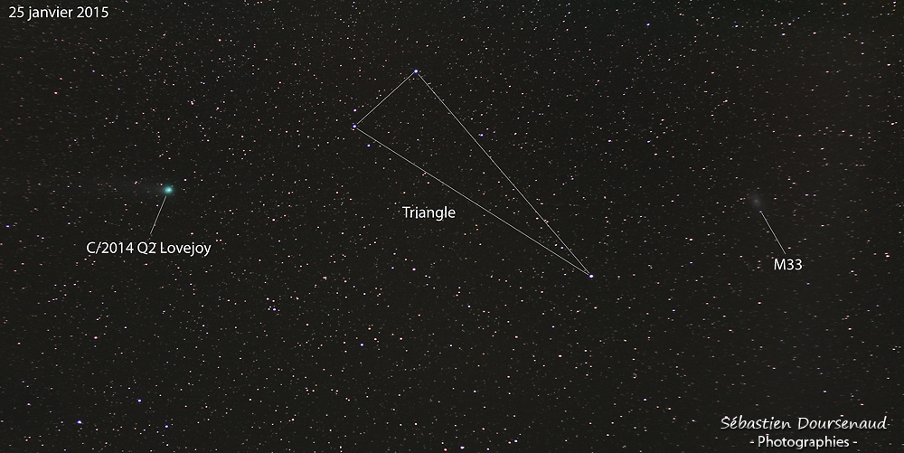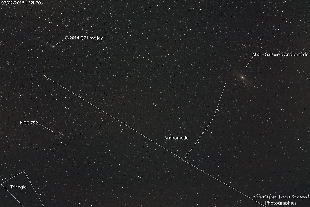 la nuit a été claire même si la transparence n'était pas top, la comète C/2014 Q2 (Lovejoy) continue sont petit bonhomme de chemin en s'éloignant dorénavant du Soleil et de la Terre, son éclat diminue donc progressivement mais elle est toujours visible dans la constellation d'Andromède au voisinage de la galaxie du même nom (qui, au passage, est la galaxie la plus proche de nous smile).
