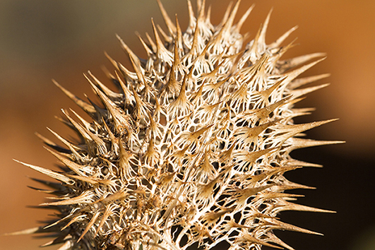 Bravo Rob et bravo Seb, vous avez tout juste, c'est une capsule de Datura Stramonium dont les partie les moins ligneuses ont été "dégustées" par les micro-organismes qui recyclent à peu près tout sur terre ; ci-joint une capsule encore un peu épargnée, à l'automne elle était totalement verte, comme un marron.