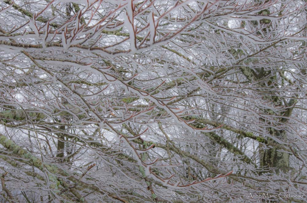 En passant à Ronceveaux, vent secouant les branches givrées donc floues