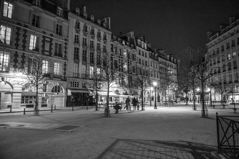 Humains jouant au Mölkky sur la place Dauphine, nouveau jeu de quille faisant fureur dans la Capitale, soir tard (essai de nuit main levée).