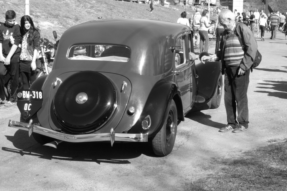 J'aimerais seulement je suis arrivé tardivement et j'ai croisé de superbes carrosses d'entre deux guerres retournant sur Limoges... Néanmoins il me reste cette Mercedes W120/W121 construite entre 1953 et 1962 utilisé fréquemment en Taxi tellement c'est robuste, d'ailleurs je pense que celle ci était un ex-taxi Portugais vu la peinture bi-ton majoritairement noire et le dessus en vert, les couleurs des taxis Portugais ont changés dans les années 90 pour une couleur uni beige/sable particulièrement banale d'ailleurs.