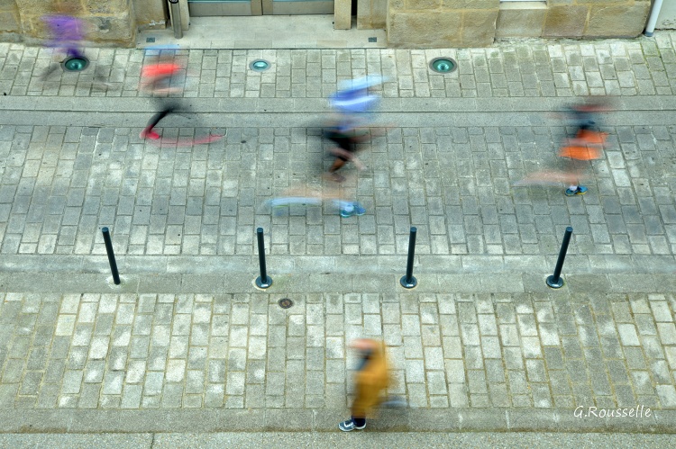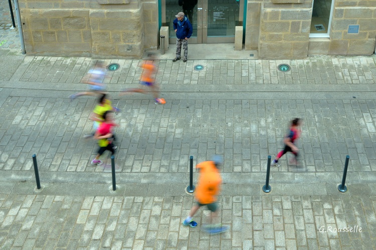 La 4 est ma préférée de loin, ce photographe net et immobile qui immortalise le temps qui passe représenté par le mouvement des passants/coureurs, bien vu.