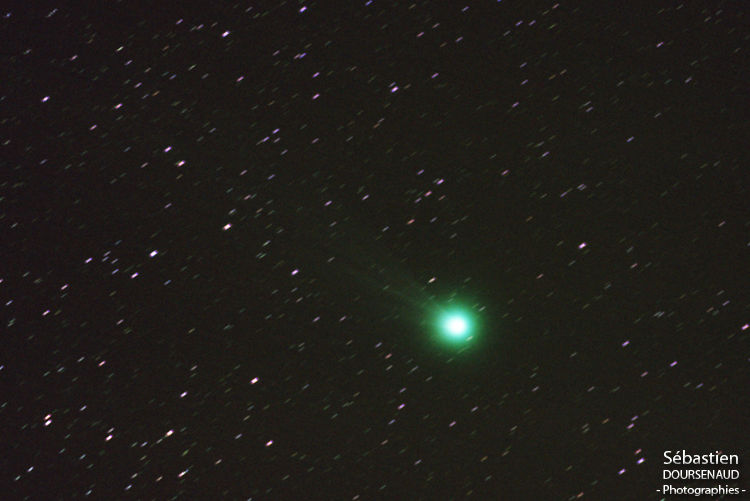 La couleur vert bleuté de la coma qui entoure le noyau est due au dégazage de carbone. Contrairement à ce que peut laisser penser l'image, la comète ne se déplace pas dans le sens opposé à la petite "queue" qui est visible sur l'image, sur ce cadrage elle se déplace de bas en haut, la "queue" ionique (ce n'est pas une "queue" de débris) indique la direction du vent solaire qui "arrache" des ions au noyau.