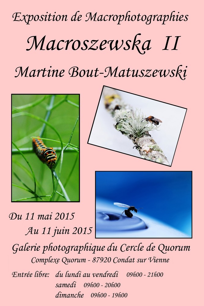 Du lundi 11 mai 2015 au jeudi 11 juin 2015, à Quorum, j'ai le plaisir de présenter une exposition de macrophotographies consacrée au petit peuple de nos jardins et de notre campagne.