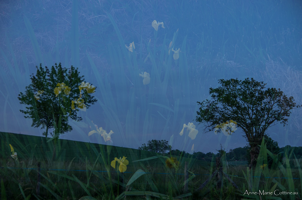 Voici des petites fleurs dans de grands arbres : impression et surimpression