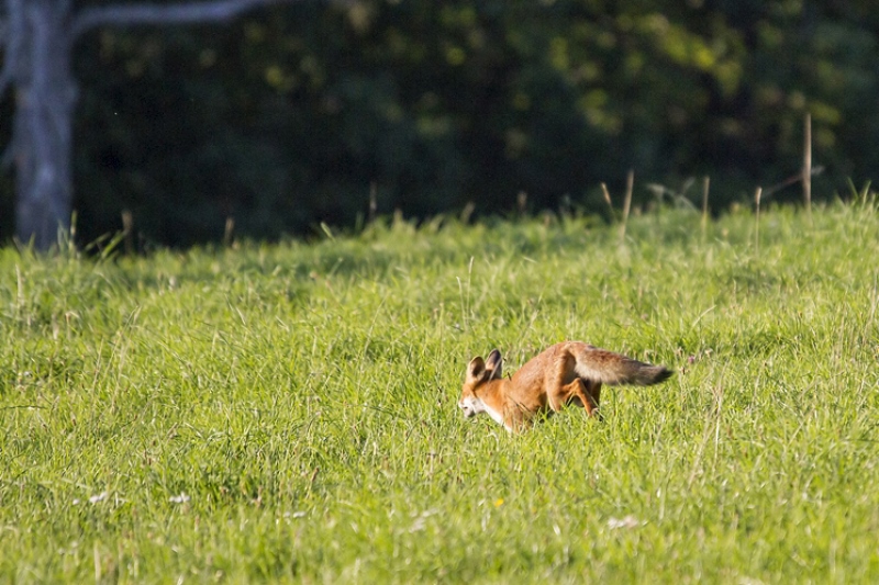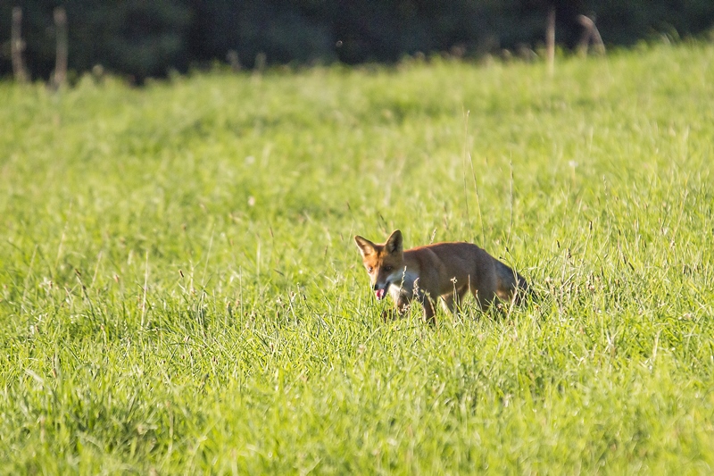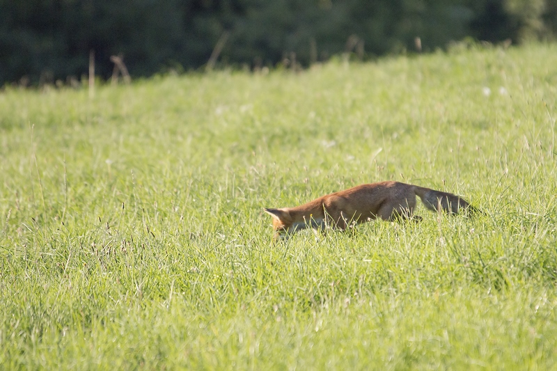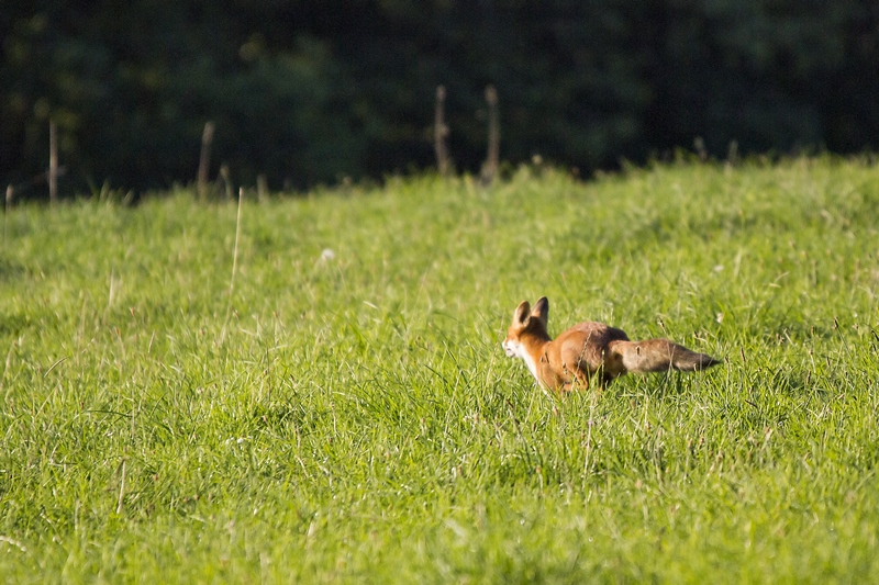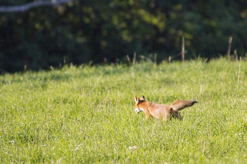 La qualité d'image n'est pas vraiment au rv, mais je voulais partager avec vous un peu de mon émotion : hier soir, à la billebaude, à la recherche d'un cerf, je "tombe" sur goupil : 1,2,3, "je cherche mon casse croute dans l'herbe haute", 4, " tiens, c'est quoi ce bruit de frottement et cette forme bizarre qui n'est pas là d'habitude", 5,6,7, "un bipède, sauve qui peut ..." ; le tout a duré moins 2 minutes ; j'ai vu 2 autres renards qui m'ont éventé trop tôt et un couple de chevreuils, même punition ; mais la soirée a été formidable.