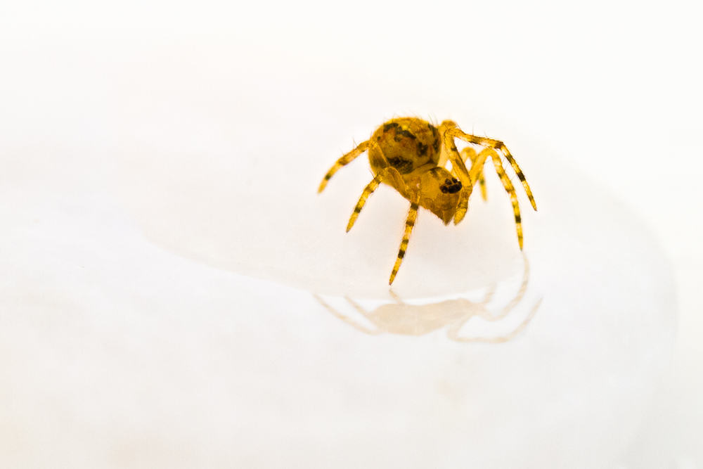 Initialement, j'ai essayé de photographier cette petite araignée (qui doit faire 2 ou 3 mm) sur une surface plane et blanche, mais la bête est vraiment vivace et n'apprécie pas trop la lumière des projecteurs (de simples lampes led dans le cas présent) !