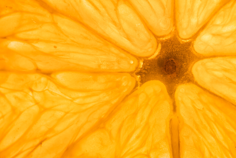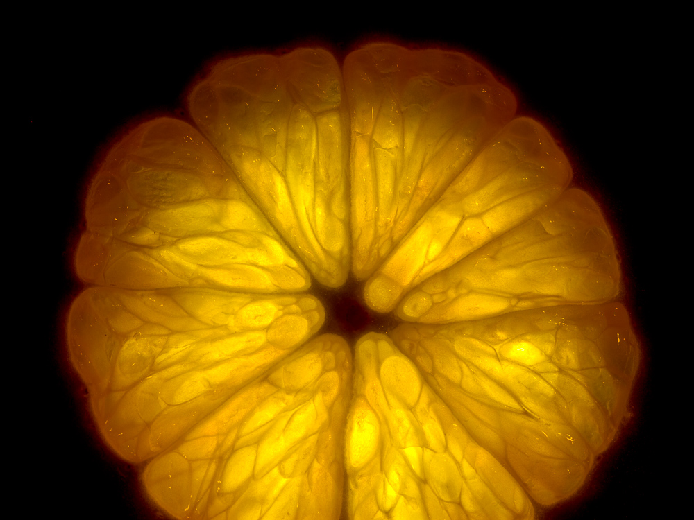 J'avoue qu'au début je cherchais juste à faire des essais pour tenter d'apprivoiser mon nouvel objectif macro et je me suis dit qu'une orange pourrait peut-être me servir de modèle. L'éclairage par l'arrière c'est un peu imposé de lui-même (je ne suis vraiment pas doué avec un flash).