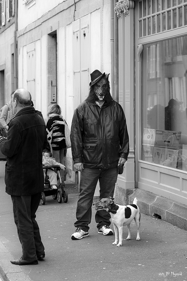 après l'homme à la tête de choux, voici l'homme à la tête de loups, rencontre étonnante , de la vraie street photo avec un bel instant décisif...