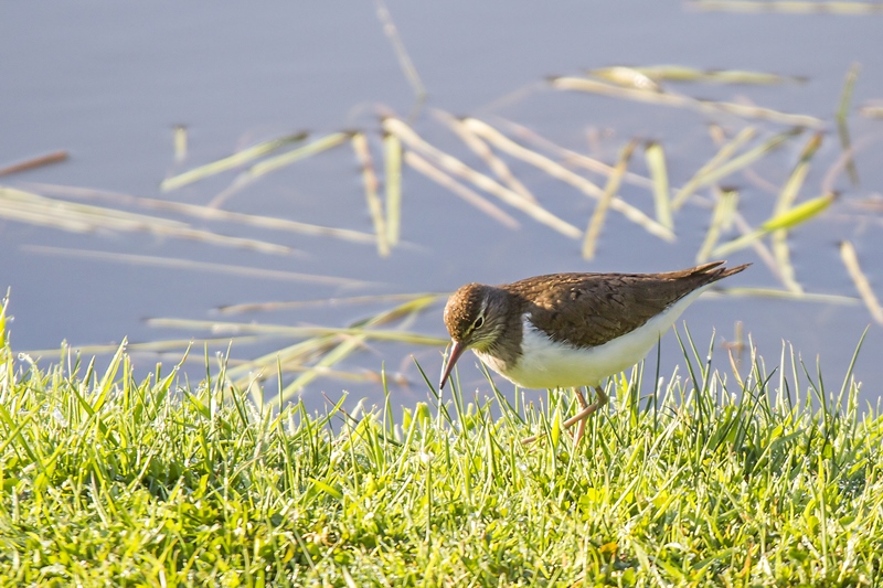 Petit dej. dans la rosée du matin au bord de l'étang pour ce chevalier guignette, insensible à ma présence en voiture mais totalement inapprochable à pied.
