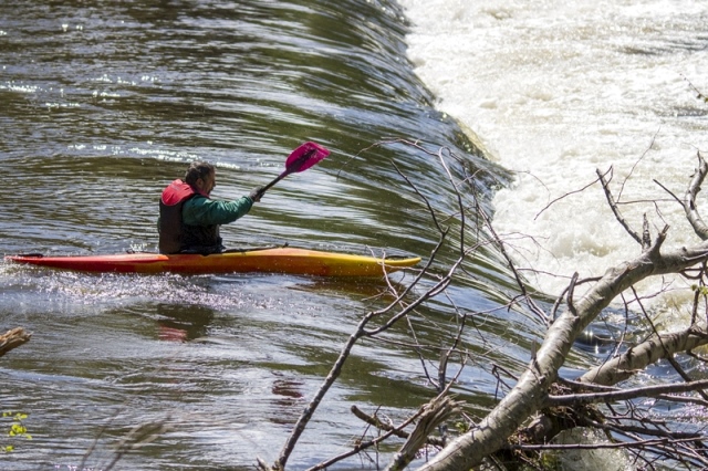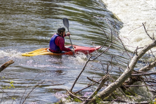Dimanche matin, la Creuse avait un gros débit, et l'eau était, pour le moins fraiche, alors, pour franchir l'écluse du moulin de La Barde à La Celle Dunoise, il valait mieux choisir la bonne veine ... d'eau ; les trois premiers ont bien choisi, en rasant l'arbre couché, le quatrième a peut être eu peur de s'approcher, mais n'étant pas dans la bonne veine, il a planté dans les rochers, sans casse toutefois.
