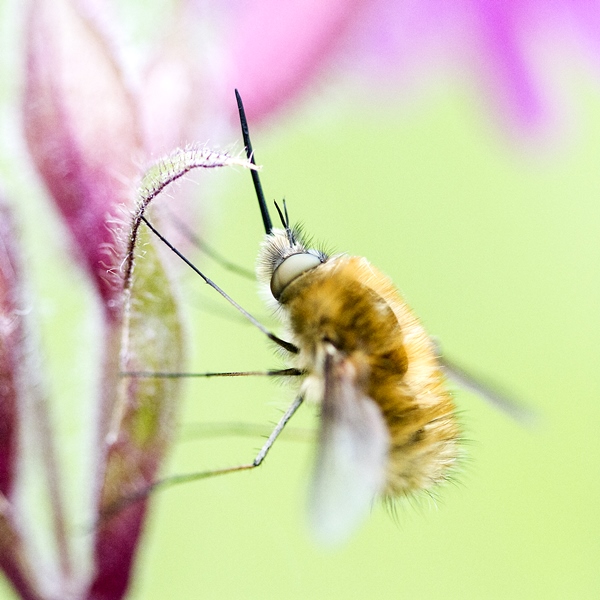 Série bombyles sur fleurs de compagnon rose ; le temps est gris et frais et ces petites mouches sont nettement plus calmes qu'en plein soleil.