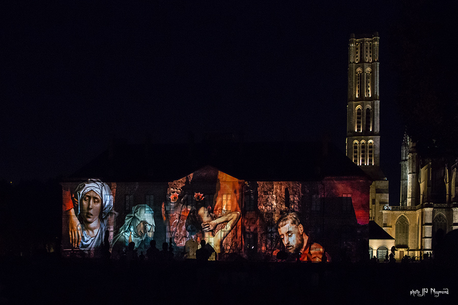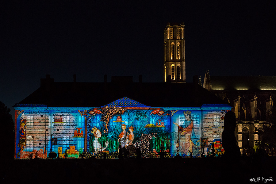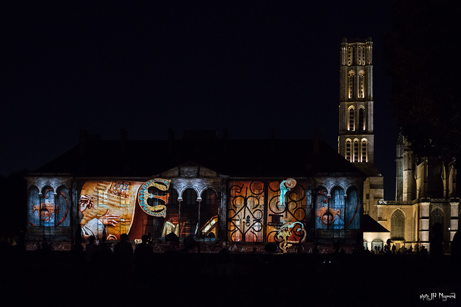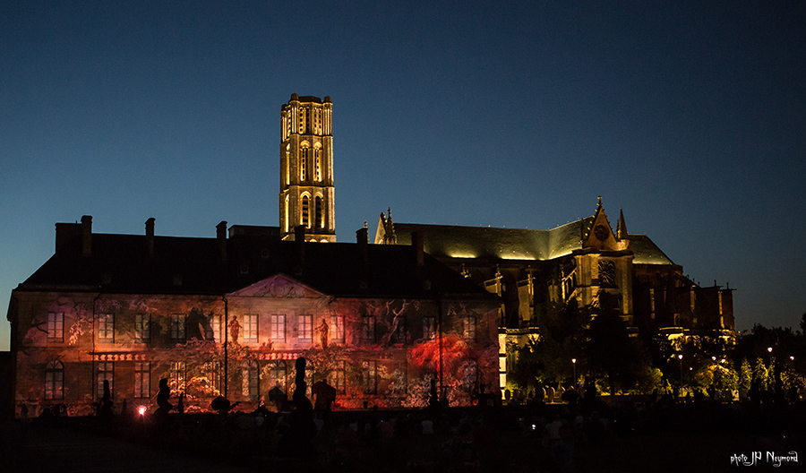 Beau spectacle en effet ( quoique les choix musicaux puissent être discutables ) qui habille la facade de l'évéché. Les sculptures de Marc Petit y prennent, du coup, une nouvelle dimension.
