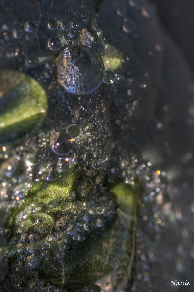 J'ai choisi de sous exposer car le soleil était déjà très présent . Les gouttes d'eau sur des végétaux, verts le + souvent, donnent cette ambiance froide.