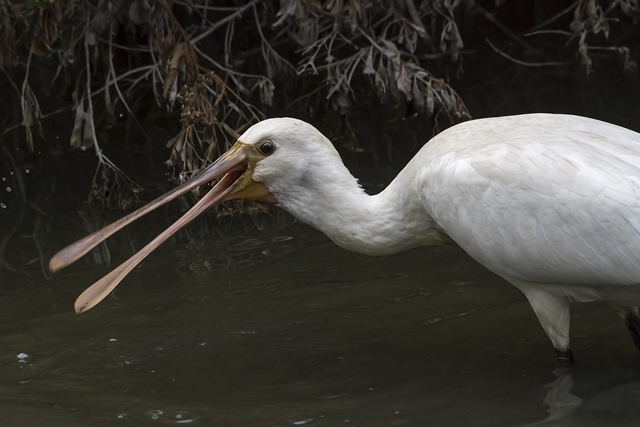 Je pense que ce sont des roseaux... le perchoir est un arbre mort au milieu de l'eau les herbes se trouvent à 5 ou 6m derrière... Mais avec la lumière de merde qui régnait (il pleuvait)... pour garder une vitesse raisonnable (parce que la bête est turbulente, imprévisible et que 1/500 ne suffit pas) et une ouverture "convenable", l'ai dû monter de manière déraisonnable (pour le 7D) dans les zozos... alors çà peut être n'importe quoi, y compris du moiré