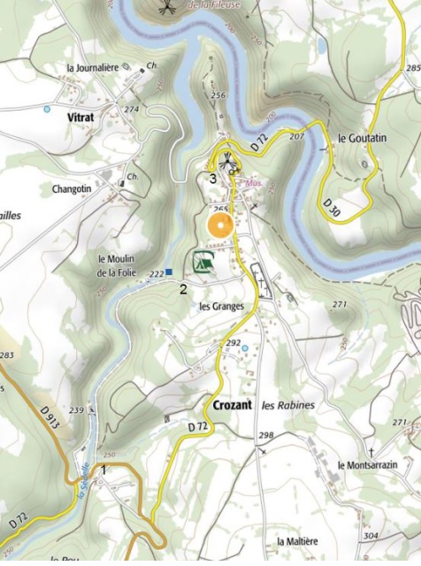 Si tu décides de rester un peu plus longtemps sur le site, Crozant 2 te donne un sympathique parcours, qui part du pont de la Chassagne et longe la Sédelle par un large chemin carrossable ( de 1 à 2 ) avec deux anciens moulins (privée) , puis le sentier grimpe un peu sur le haut de la côte et te ramème en vue des ruines du château ( de 2 à 3 ) Cet itinéraire est toutefois à l'ombre le matin, au moins en fonds de vallée.