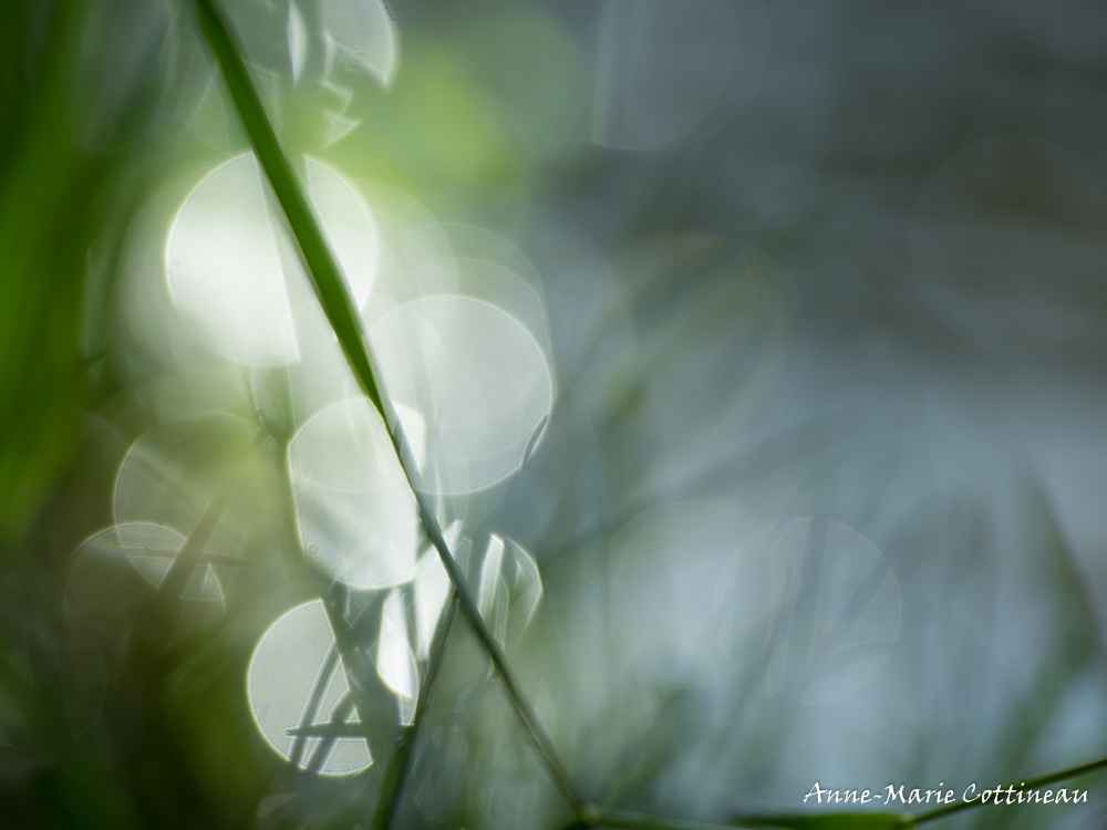 En réalité c'est une photo au milieu d'une journée ensoleillée, à l'ombre près du ruisseau, au ras du sol, les gouttes d'eau éclairées par le soleil... J'ai essayé de mettre au point sur la petite mouche sur le brin d'herbe.