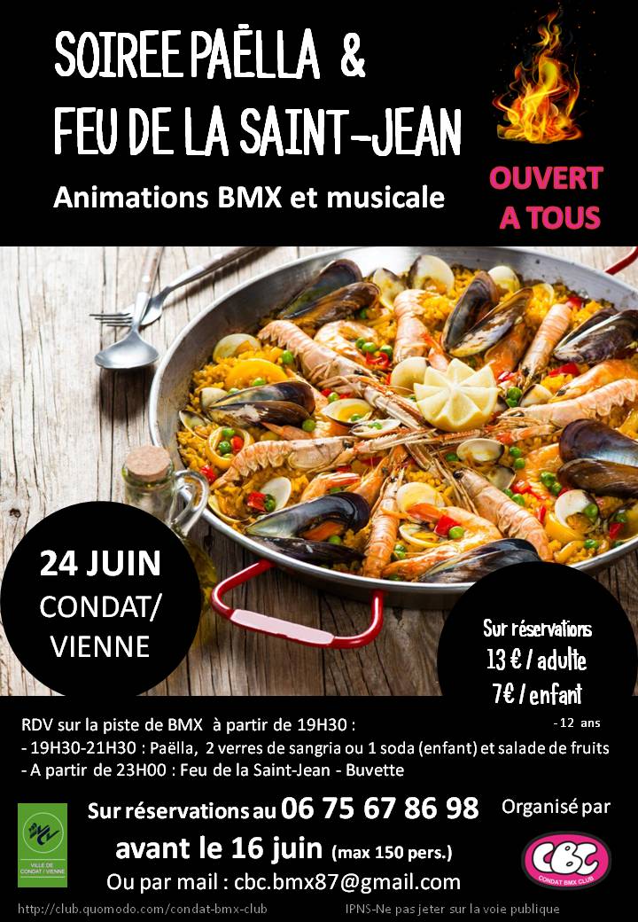 Le CBC club de condat font une soirée paella le 24 juin à Condat S/vienne avec animations BMX. C'est dit