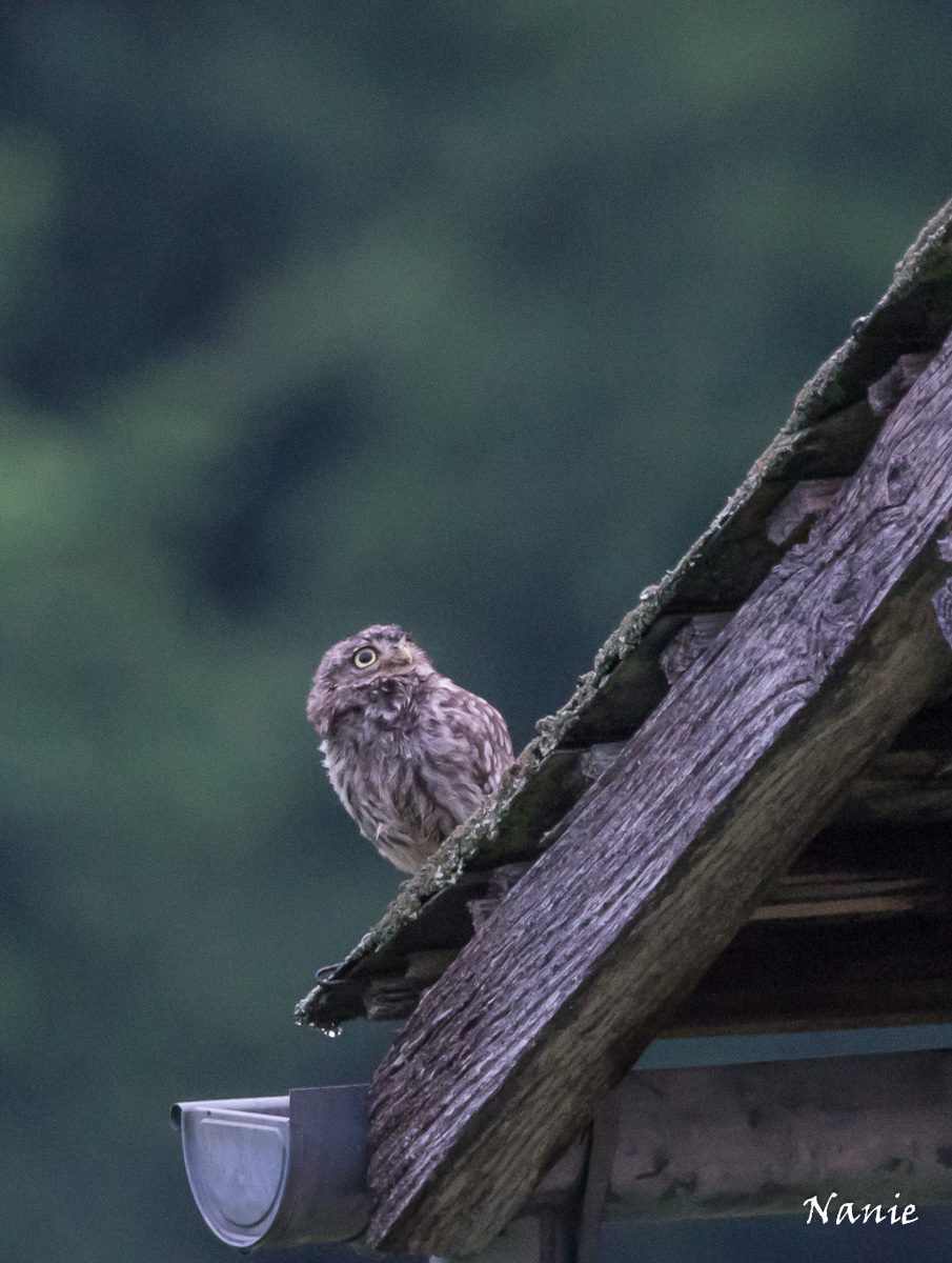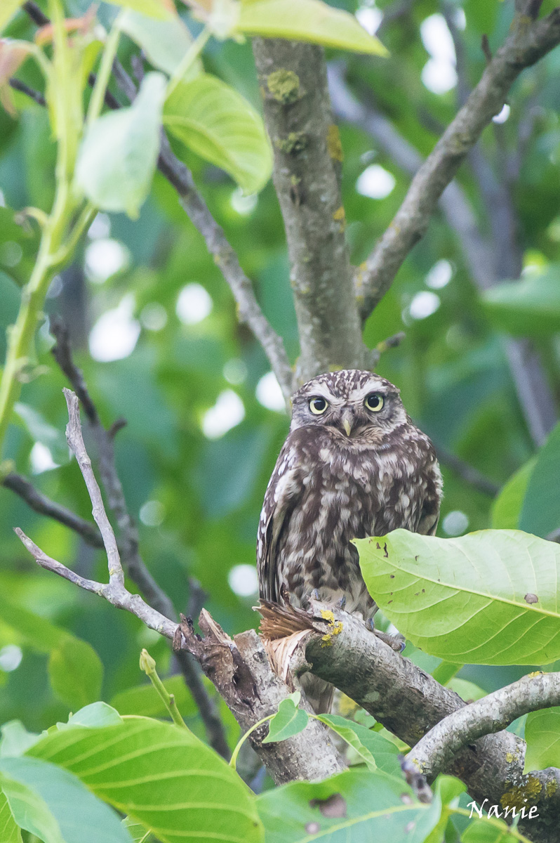 Notre petite chevêche d'Athena est à la ferme depuis plusieurs années. Elle n'hésite pas à se montrer de face, de profil ou encore la tête sous l'aile...