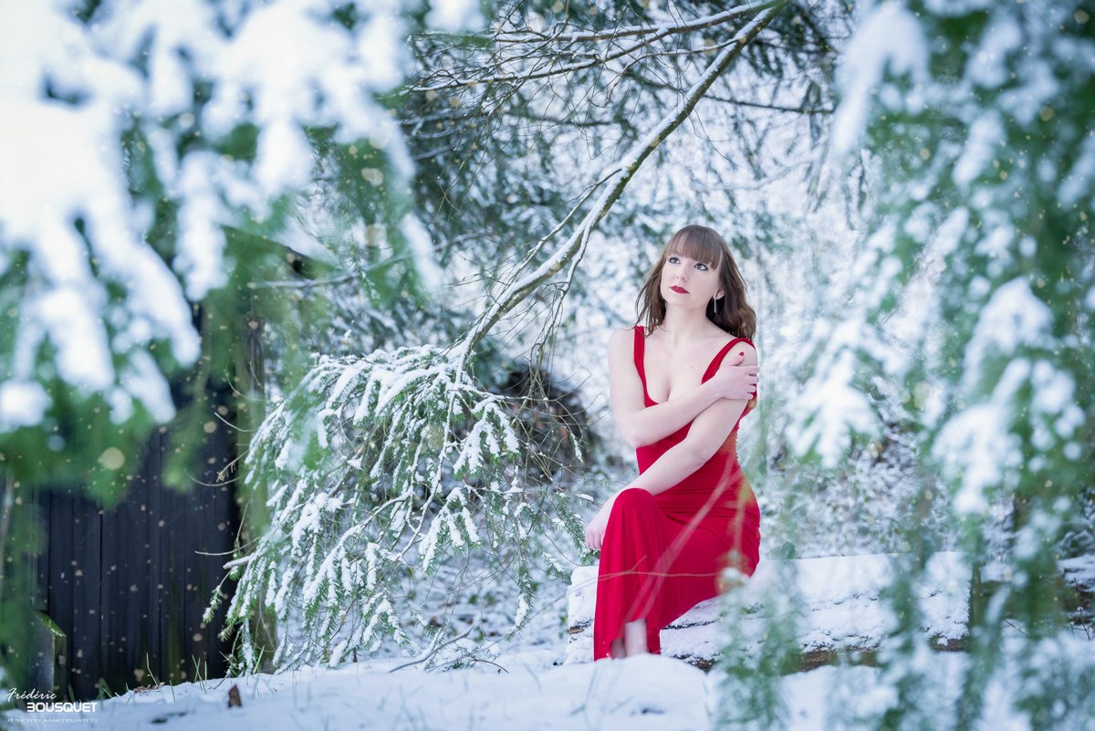 Très jolie photo mais comme les copains, les petites branches devant sa robe gênent.