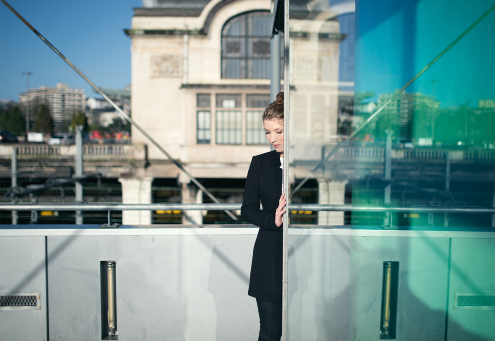 Pour la 3eme je trouve que veste planche apporte une lumière et un reflet intéressant que le noir n’aurait pas apporté. Apres pour le pentalon la modele etait partie sur ce modele noir. J’avoue que le blanc aurait etait plus sympa pour la deux..mais d’etre en ville n’est pas forcement le plus facile pour changer de tenue comme ca. Pas la facilité du studio ou de la photo d’interieur.