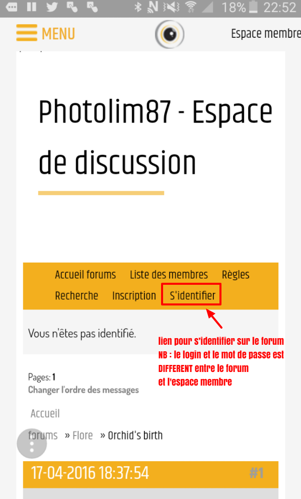 Paul, le lien vers "espace membre" permet de modifier les images de ta galerie photo (entre autre) ; pour te connecter sur le forum tu dois t'identifier sur le forum en cliquant sur "s'identifier" dans le bandeau orange (si tu es sous android, ça peut être différent sous iOS).