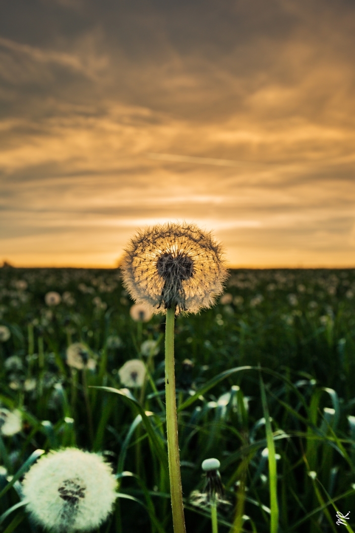 Allez en avant pour le fil rouge avec une tentative pissenlit au soleil couchant