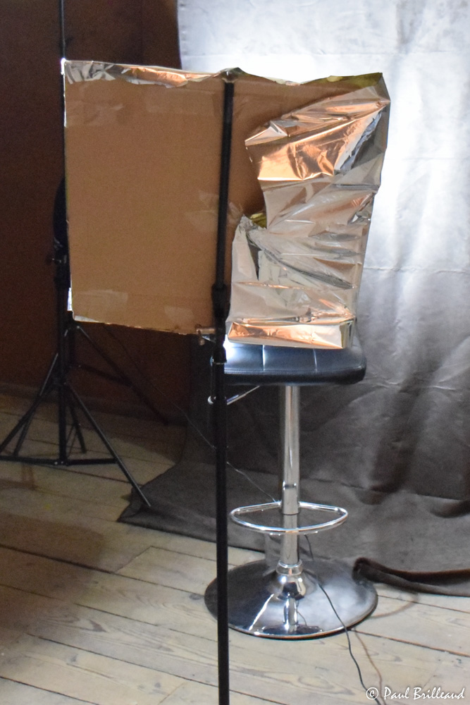 1 pied de micro avec un bout de carton recouvert d'un bout de couverture de survie pour me servir de réflecteur.