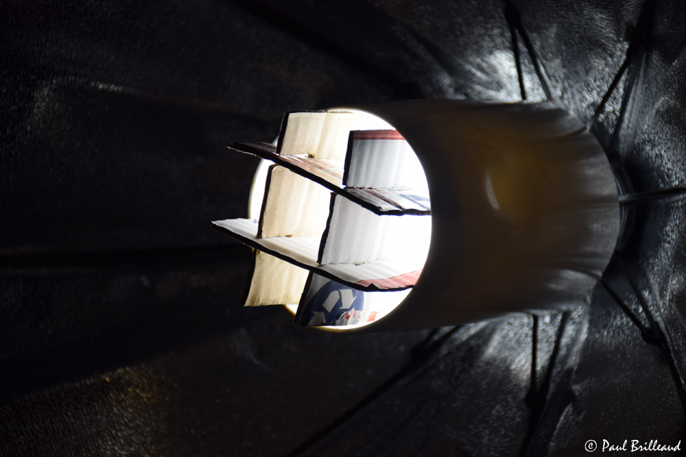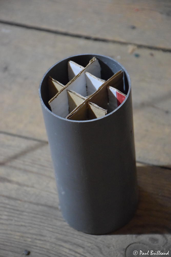 pour diriger le faisceau j'ai recouru à des chutes de plomberie avec des bouts de tubes PVC de 100, ensuite j'ai fait du découpage de carton pour simuler des nids d'abeilles.