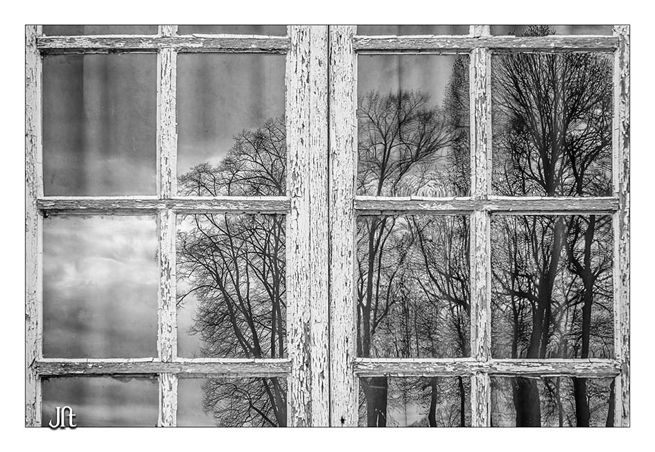 - 1ère lecture : reflets dans une fenêtre de la nature (arbres, dont sont faites - au moins partiellement - les fenêtres) ... "métaphore" de la transformation de la nature par l'homme, une capacité qui distingue et défini Homo Sapiens au moins depuis Home Erectus ... Son ADN culturel, social et économique ... L'image renvoie donc à l'Homme, à ses caractéristiques profondes, bien qu'il soit absent et que ne subsiste dans l'image que sa production ... Une illustration, un constat, de la culture profonde et immémoriale de l'homme ... souligné par la décrépitude relative de la fenêtre et la "nudité" des arbres ...