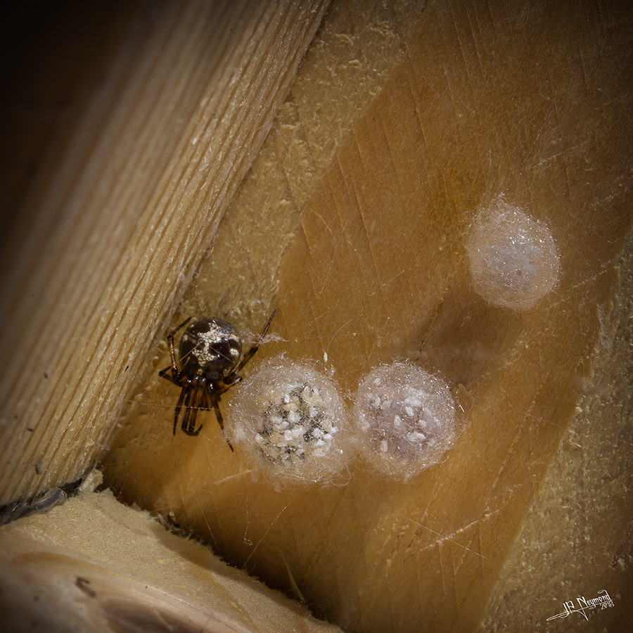 En faisant un peu de rangement... nichée dans une vieille caisse en bois, cette petite araignée (<>5mm), dont j'ignore tout, semble veiller sur sa progéniture...