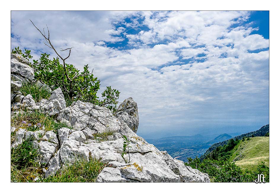 hum ... D'abord, après une longue montée à travers forêt et paturages, j'étais plutôt euphorique ... et puis, ces affleurements rocheux, très blancs sous un soleil de plomb -alors même que le ciel devenait très menaçant - qui venaient comme couronner cette immensité verte et jaune, elle-même noyée dans un océan cyan-bleu-violet comme un présage d'anéantissement soft ... Ensuite, la composition en V qui permet une projection et favorise l'envie d'aller au-delà ... et puis l'arbre (sur la 1), qui contredit le V de la composition et s'impose en majesté dans le comtexte ; un arbre qui ma rappelé quelques toiles de Pissaro, de Fautrier, de Mondrian jeune quelques végétaux de Van Gogh ou Cézanne ... sur la 2 l'arbre se réduit à une branche qui pointe vers le ciel, mais le défi n'en est que plus grand, qui attend d'être relevé ... Voilà ! ... Une tragédie, en 1 acte, où tout est d'emblée présent et dévoilé ...