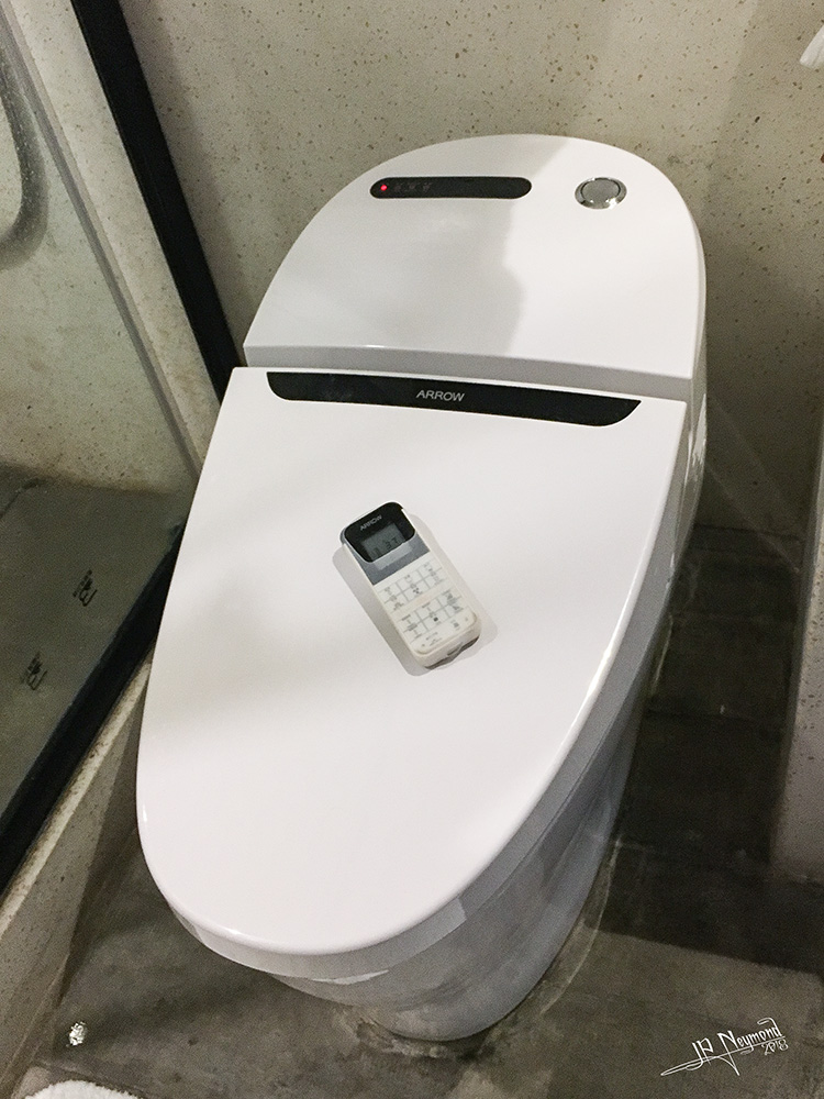 - D'autre part, à une centaine m de là, cet hôtel avec cuvette de toilettes télécommandée... siège chauffé (température programmable), aspiration d'air dans la cuvette pour éviter les mauvaises odeurs, température réglable de l'eau de la chasse d'eau, prise USB pour écouter la musique... et j'en passe... je vous garantis que ce n'est pas un gag...