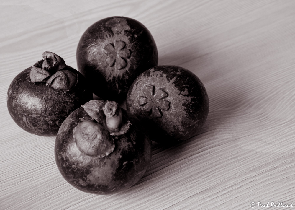 4 mangoustans sur les rayures de ma table de cuisine ...