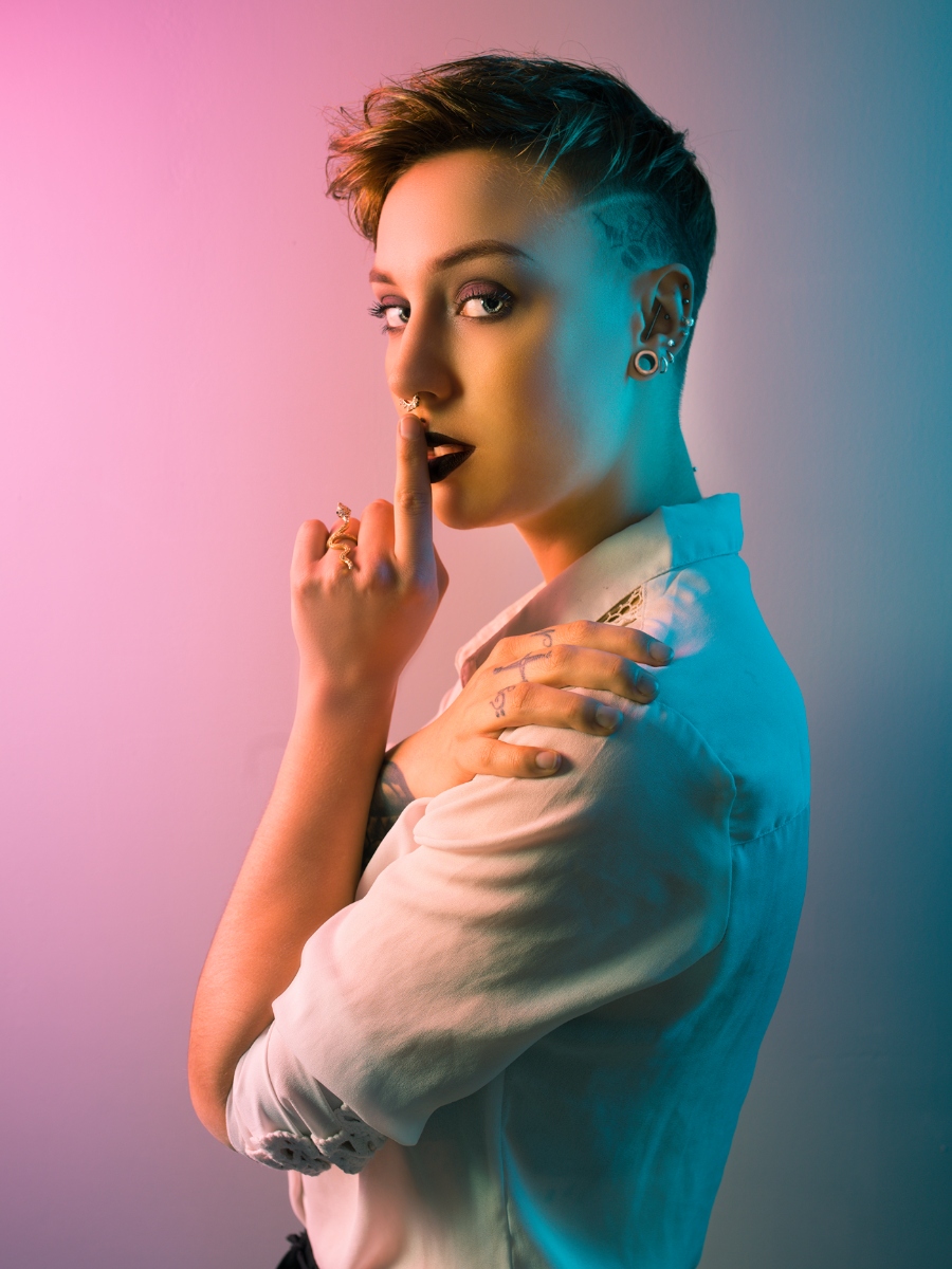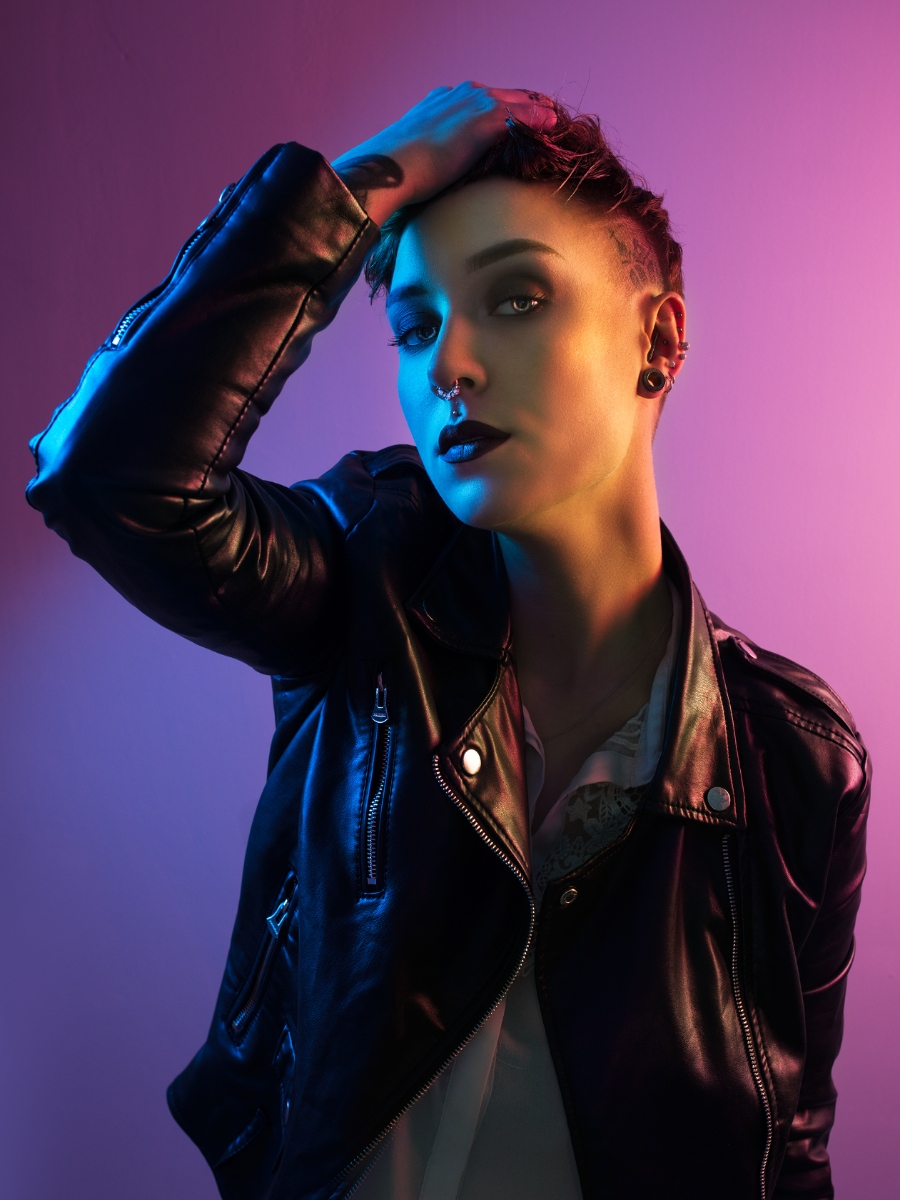 Perso, je n'aime ni le fond uni, ni le cadrage ... désolé ... Par contre, j'aime bien les épaulettes, les poings qui tiennent le col relevé et la coupe de cheveux (dommage qu'elle n'ai pas le menton légèrement plus enfoui entre ses poings, ce qui permettrait un regard plus provocateur et défiant ) ...