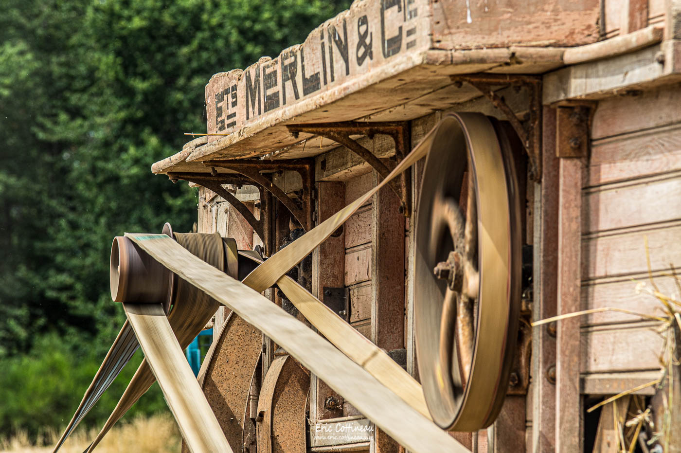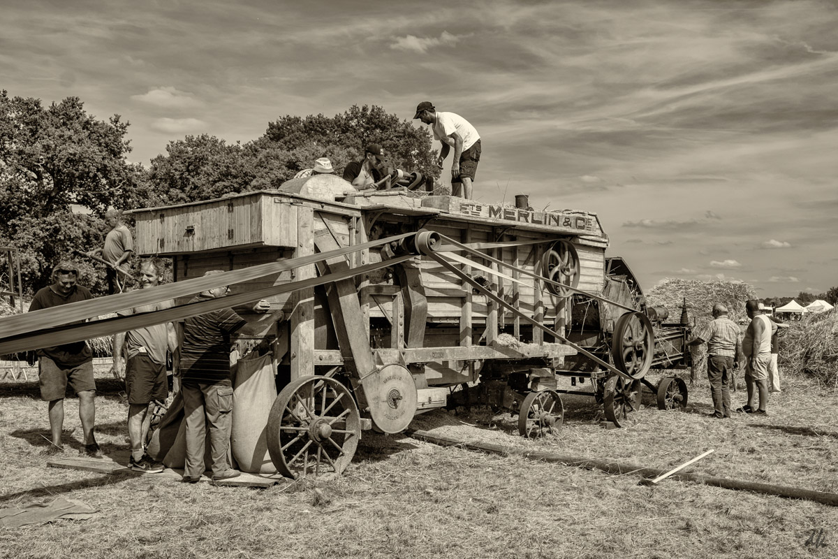 des animaux à la voix tonitruante des hommes, la batteuse et le flat des courroies. Le sépia va trop bien, quant à la couleur elle rappelle les premières pellicules en couleur de Kodachrome 20 ASA.