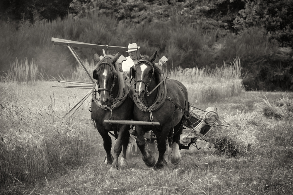 des animaux à la voix tonitruante des hommes, la batteuse et le flat des courroies. Le sépia va trop bien, quant à la couleur elle rappelle les premières pellicules en couleur de Kodachrome 20 ASA.