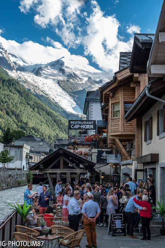 Réunion de touristes (j'ai vérifié, English people) à Chamonix sous la vigilance du Mont blanc et du glacier des Bosson.