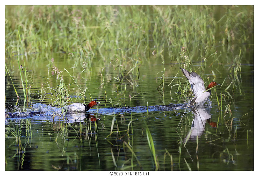 Combat de coqs pour les Foulques macroules pendant la charge sur l'intru pour le Fuligule milouin. Le canard Souchet préfère partir se mettre à l'abri