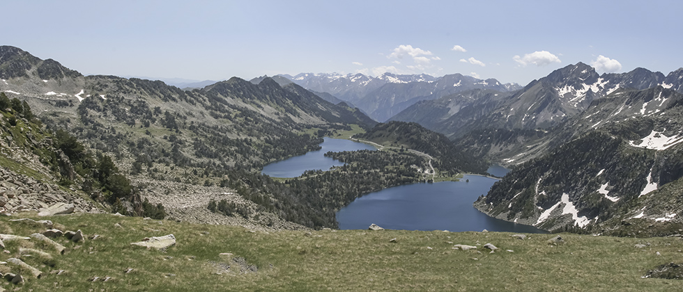 Réserve de Néouvielle : lac d'Aubert, pic de Néouvielle et pic de Ramougn ; pano à partir des Gourgs Blancs.