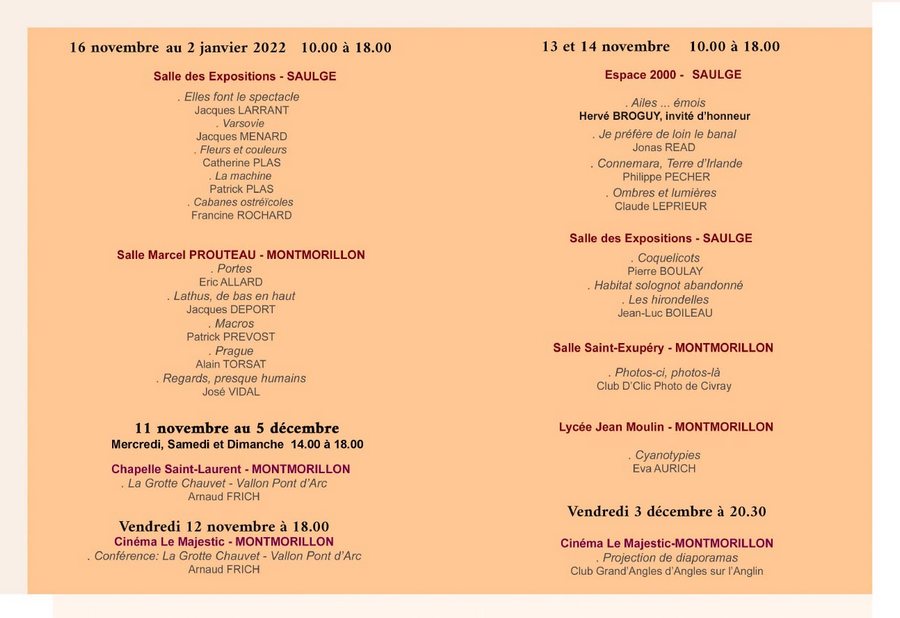 Vous êtes invités à venir découvrir l'expo de nos amis du club photo de Saulgé, à coté de Montmorillon, le 13 et le 14 novembre prochain (voir programme joint)