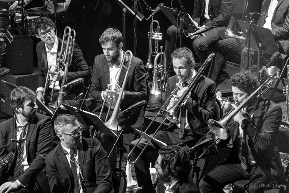 Toutes en n/b parce que la lumière était 100% rouge - rendement pas très attirant en photo et pas grand chose des autre musiciens - le trompettiste avait l'aire d'être momifié, il ne bougeait du tout, même pas un changement d'expression, et en plus il y a eu un forêt de micros devant lui et le saxophoniste.