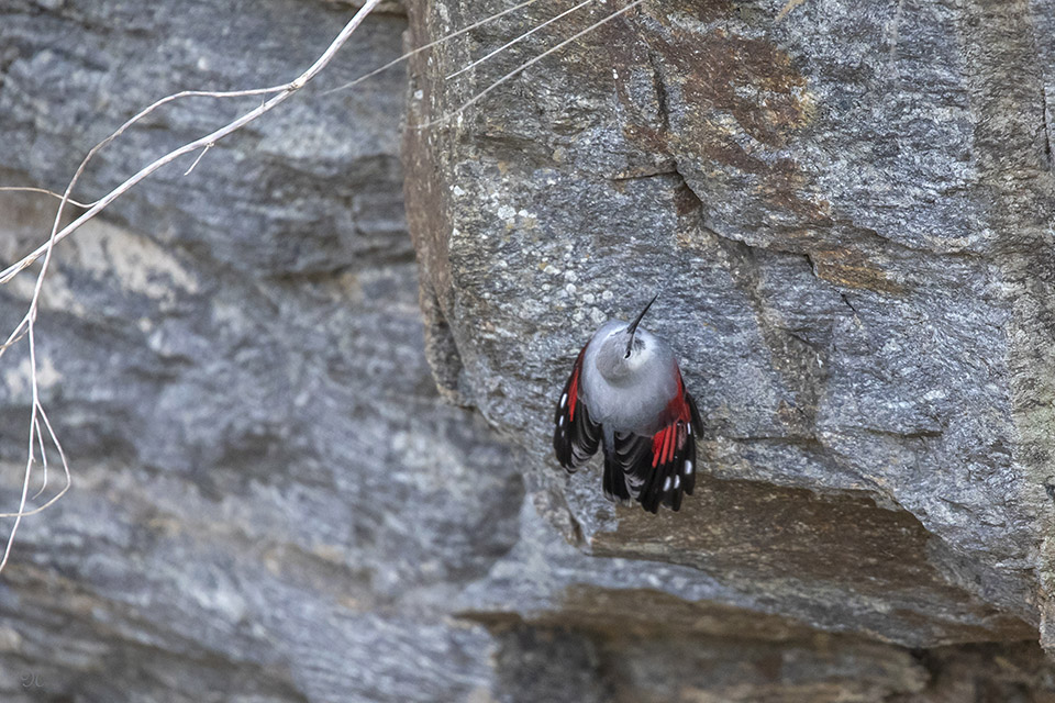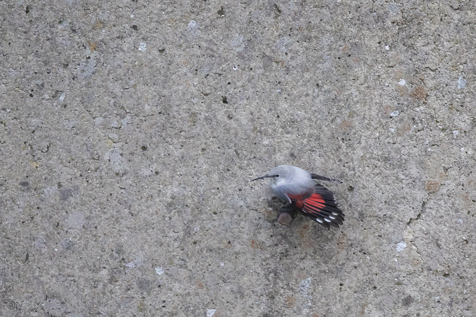 Il est plus habitué aux hautes altitudes de montagne et est, de plus, relativement rare semble-t-il : je vous présente le Trichodrome échelette, appelé "oiseau papillon", individu venu hiverner chez nous ; la bestiole n'est pas plus grosse qu'une mésange charbonnière et la dernière image est très cropée, car shootée à plus de 80m, ... mais c'est la seule dont je dispose en vol.