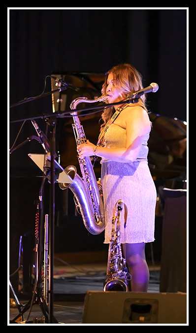 "The Blaquettes" à Dun le Palestel : 4 Nanas dynamiques et sympa, mais une lumière de m ....., et parfois, au milieu d'une forêt de micros en tous genres, le joli minois de la pianiste.