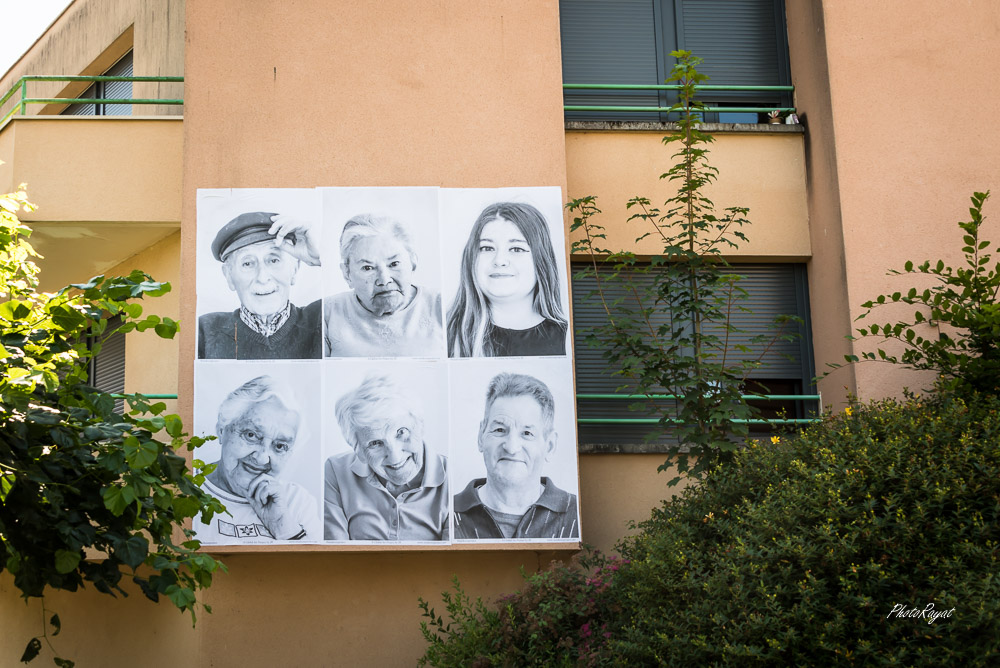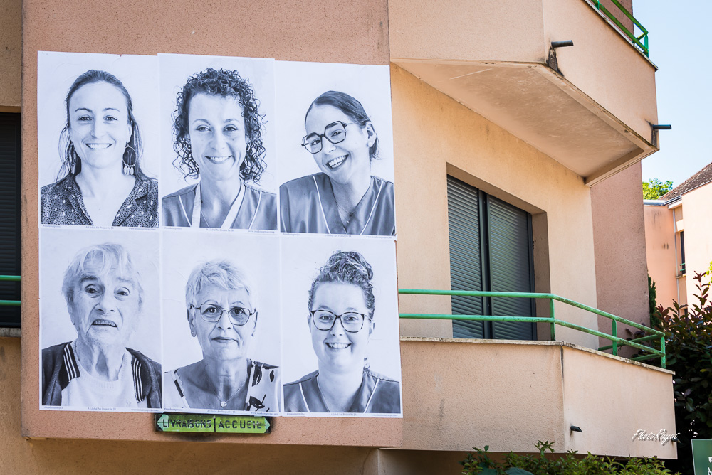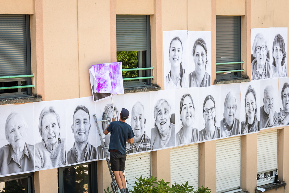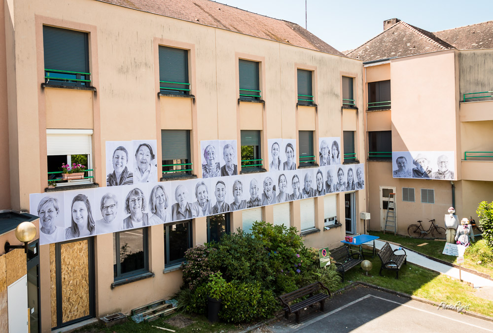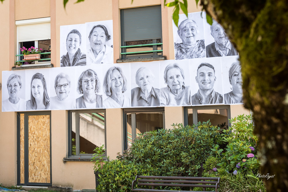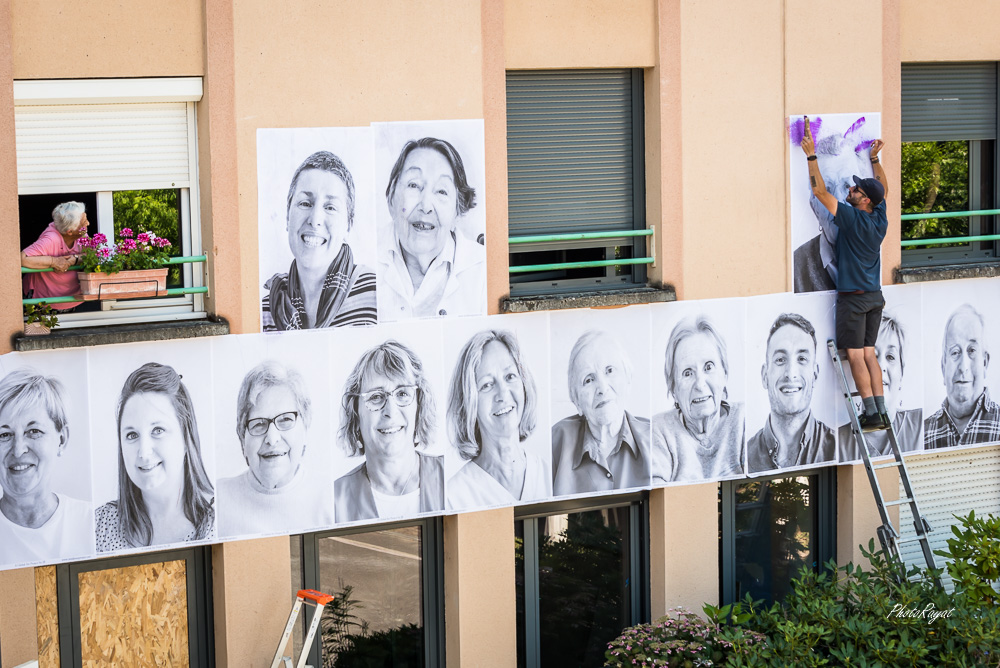 Après Châlus, me voici investi sur le projet de l’EHPAD de Nexon. Avec une nouvelle configuration, puisque cette fois-ci, c’est une approche photographique qui s’étalent en grand sur les façades de l’EHPAD, avec la collaboration de la plateforme Inside Out. Soumis aux conditions météorologiques, l’affichage est cependant temporaire.