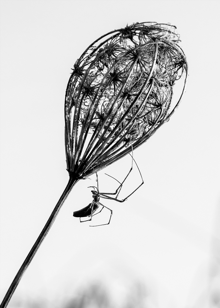 Suspendue à la fleur, l'araignée danse avec le vent tissant des perles de rosée qui scintillent comme des larmes de lumière au matin naissant.