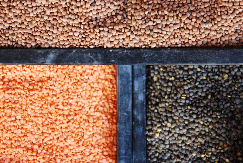 je trouve toujours ca très jolie, les étales devant les magasins d'épices ou ici de haricots, fèves, lentilles...