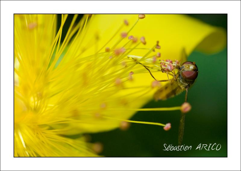 j'ai suivis cette syrphe dans les pistils d'une belle fleur jaune, où elle avait l'air de tout simplement se régaler...