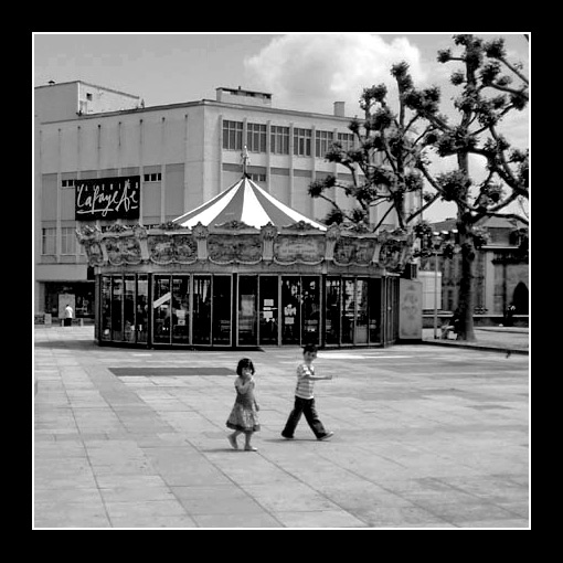 j'aimais bien les enfants devant le manège qui mettaient de la vie sur cette place désespérément désertique (je déteste la place de la rep.) : un petit moment d'enfance qui met de la douceur dans la dureté de la ville. mais dès qu'on photographie des enfants les gens vous prennent pour un pervers !