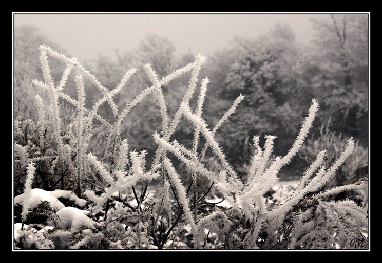 les brindilles givrées de Roland ne se détachent pas sur le sol cramé et encore moins sur son ciel , elles auraient dû se situer exclusivement pardessus le paysage d'arrière plan, donc une autre focale évidemment, ceci pour mettre en valeur le paysage ? le givre ? ou les 2 l'un sur l'autre ?
